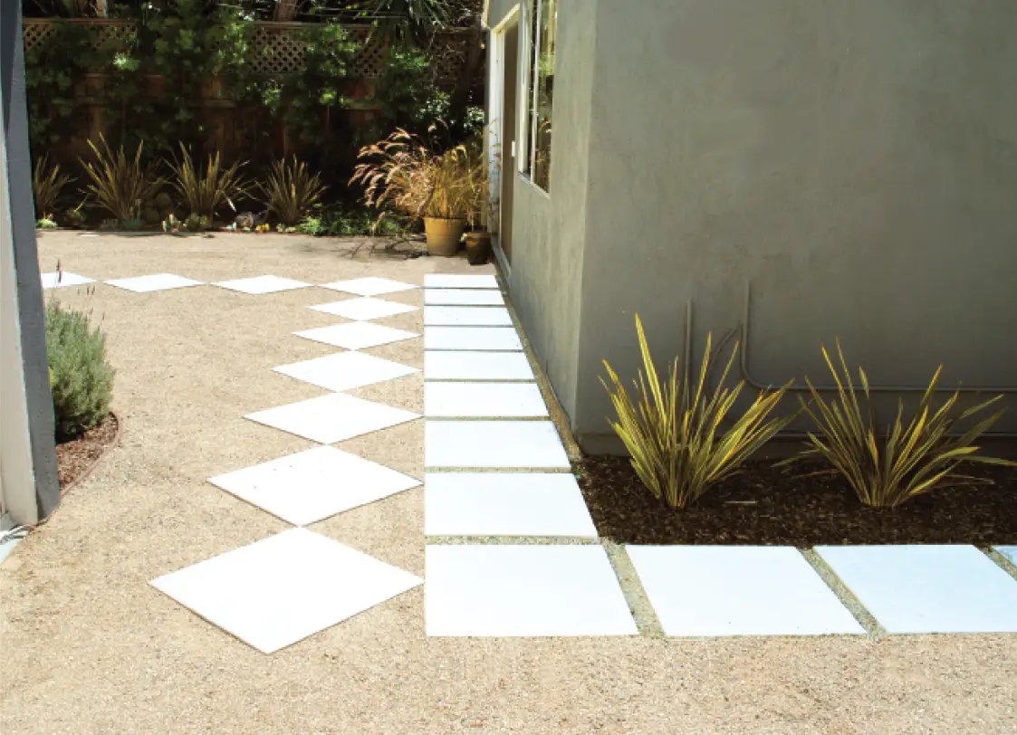 The property was a clean slate of sand without any vegetation. A design was created for a path to the proposed office and patio. Large circle shapes were filled with contrasting colors and sizes of gravel.