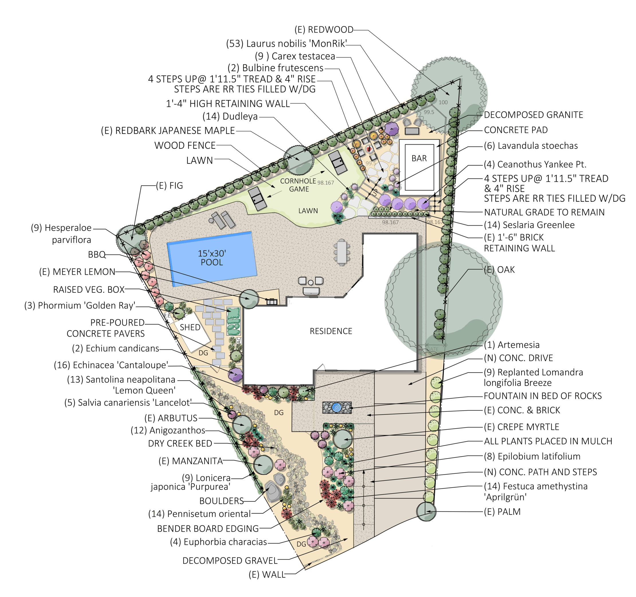 This earth-friendly project consisted of removing the backyard lawn and portions of a concrete driveway. Pre-poured concrete pavers were placed in de-composed granite for pathways and a patio for a smokeless firepit.